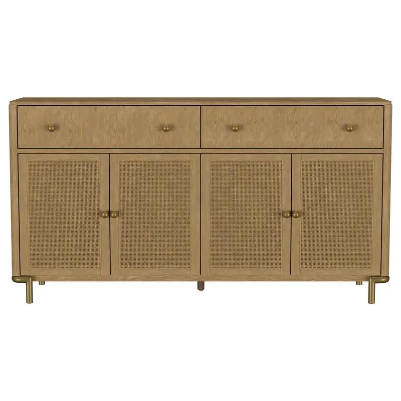 65-inch sideboard showcases a sand wash finish that embodies a modern, organic aesthetic enhanced by handcrafted woven cane door panels from Indonesia