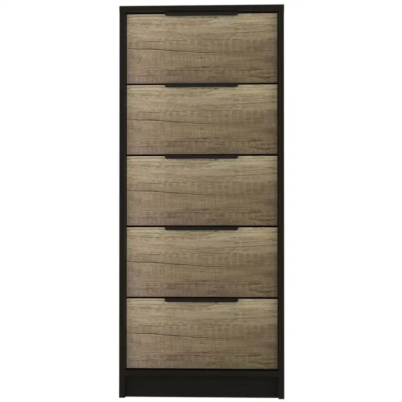The 5-drawer design provides extensive and organized storage space, ideal for categorizing and accessing items like clothing, paperwork, or household essentials. The combination of Black Wengue and Light Oak creates a striking contrast, with the deep tones of Black Wengue offering sophistication and the lighter hues of Light Oak adding warmth, while the rectangular shape and manufactured wood construction ensure a classic, versatile, and cost-effective storage solution with a smooth, consistent surface.