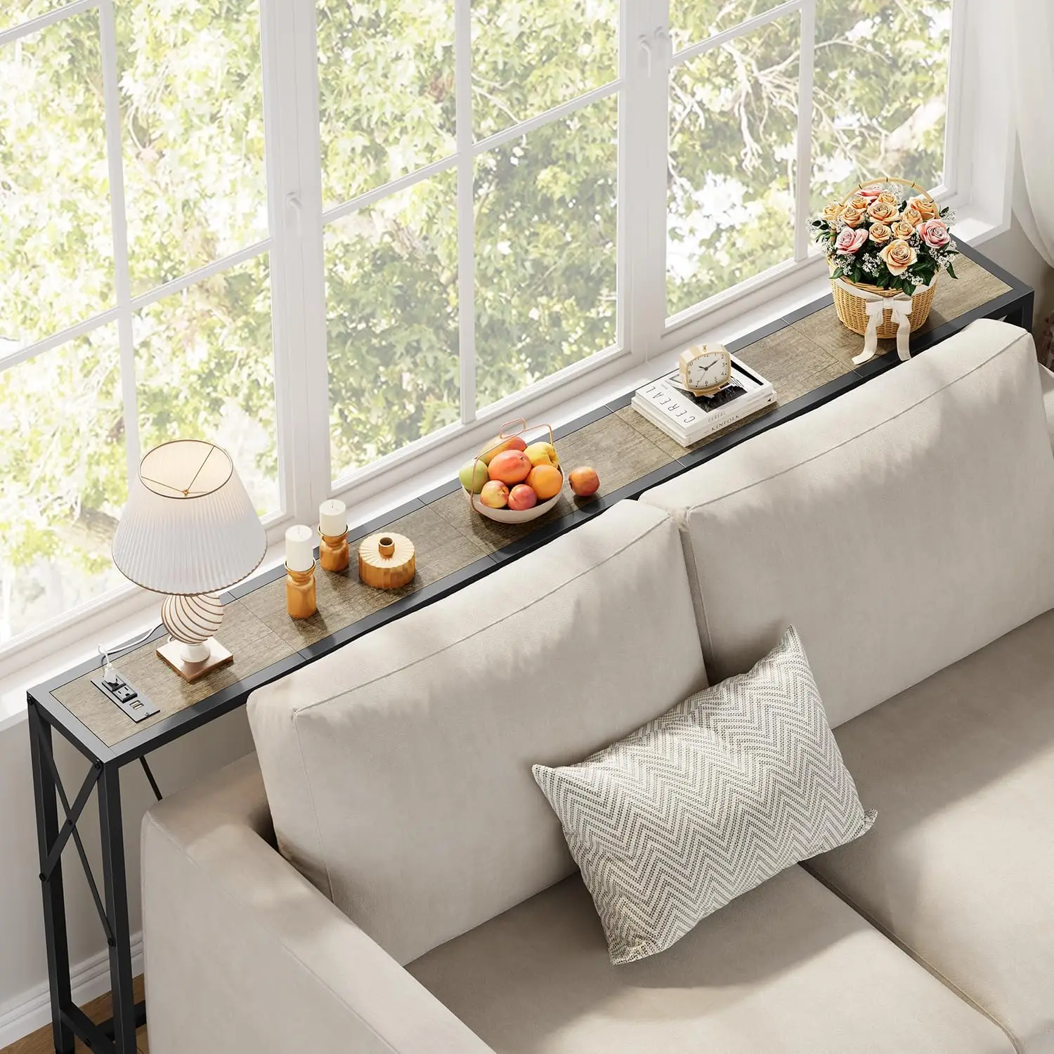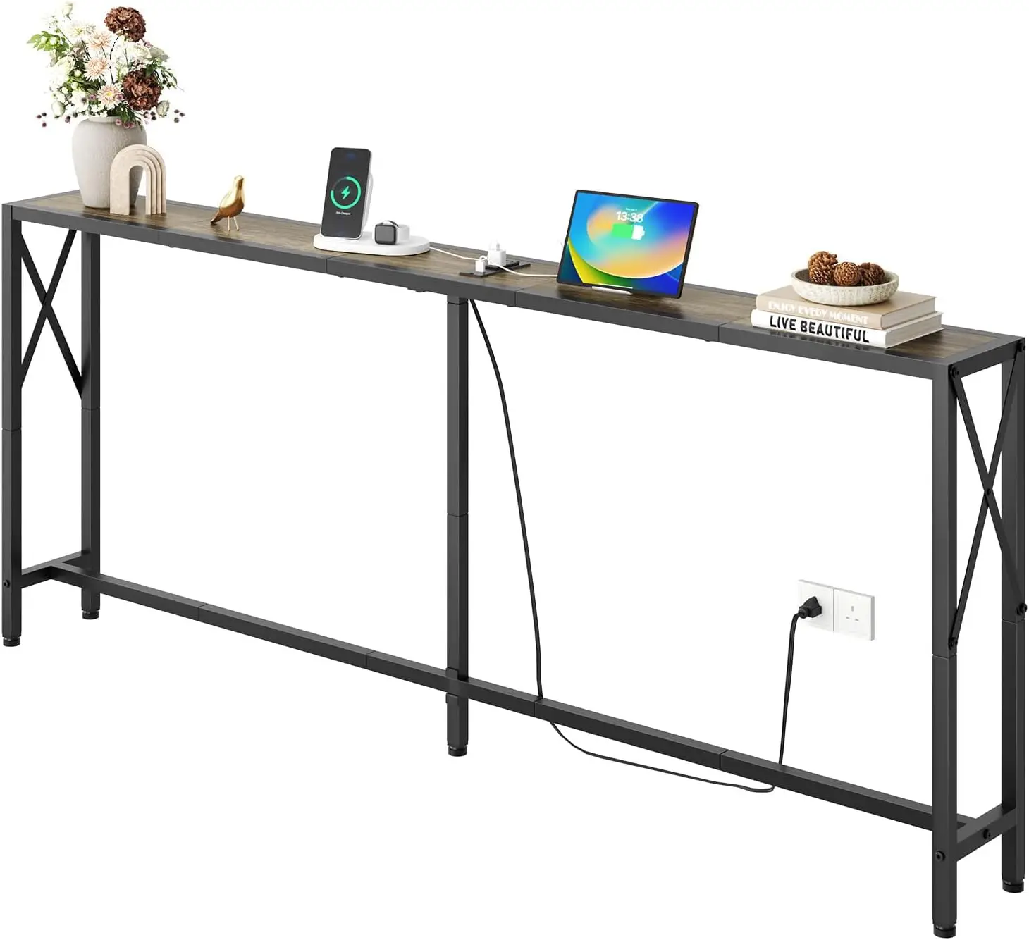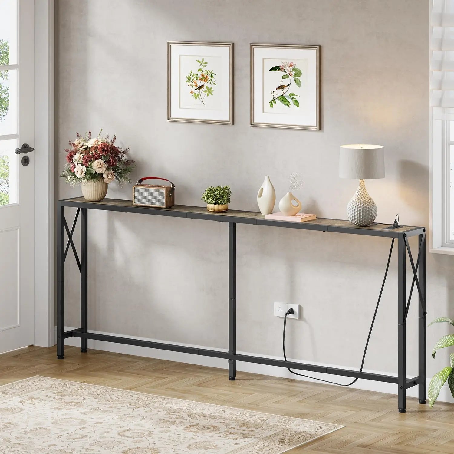 70" Sofa Tables Narrow Long, Behind Couch Table with Oulets & USB Ports, Industrial Long Skinny Stand for Entryway,Hallway
