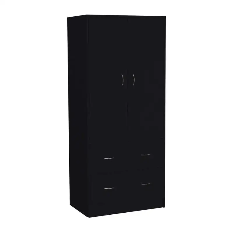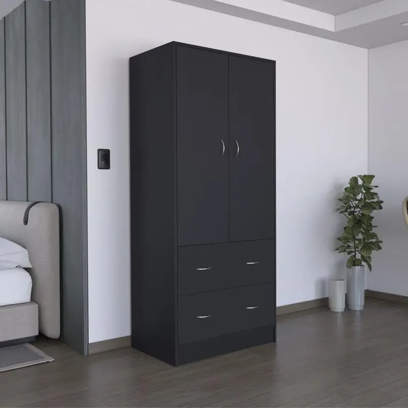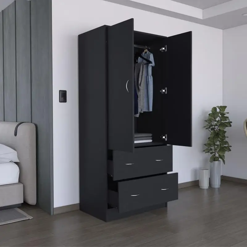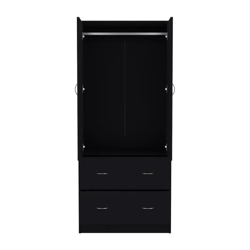71" H Armoire, 2 Doors, 2 Drawers, Hanging Rod, Black Finish, Stylish Storage Solution for Any Room