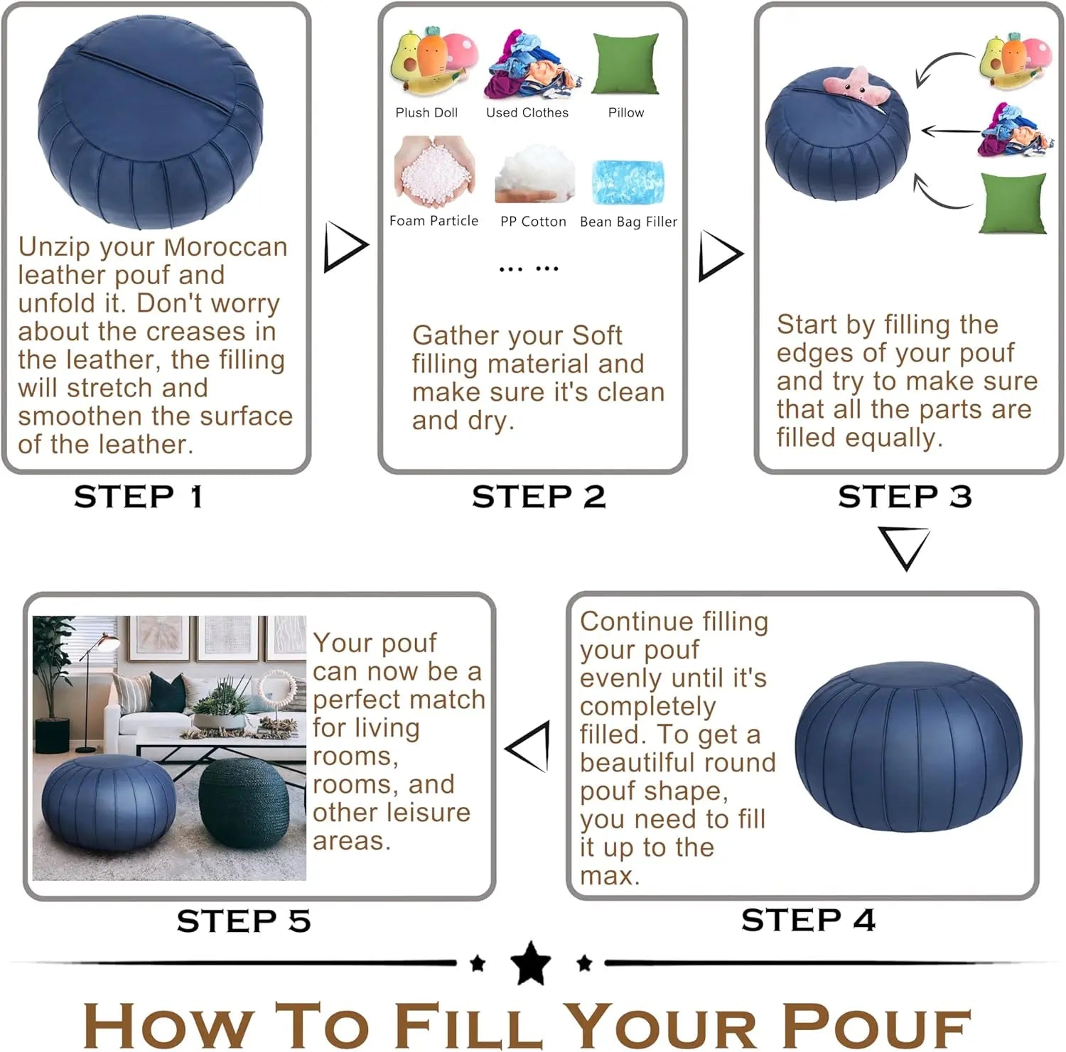 【DIY FILLABLE DESIGN – SAVE & CUSTOMIZE】: This fillable Moroccan pouf arrives COMPLETELY UNSTUFFED (no filling inside) – you choose the stuffing material and firmness! Easy to fill with polyester fiber, recycled foam, old clothes, or towels, etc.