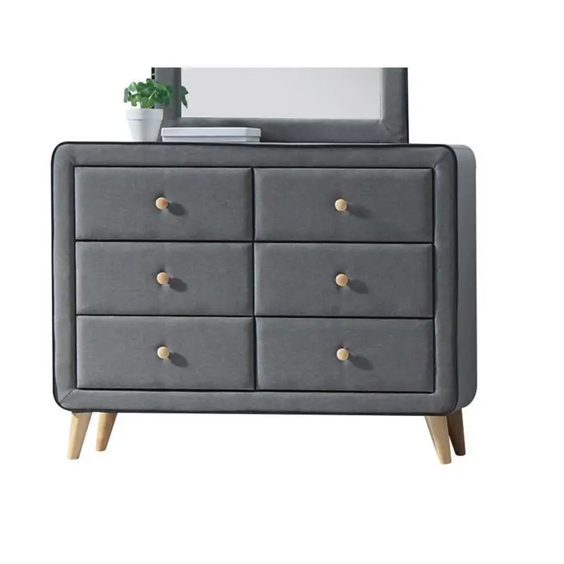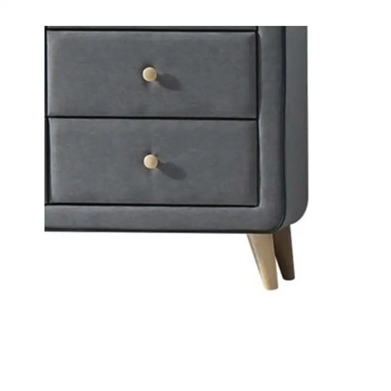 The drawers are designed with smooth side metal glide mechanisms for easy access, while the light gray fabric with black welt trim adds a sophisticated touch to its overall appearance.
