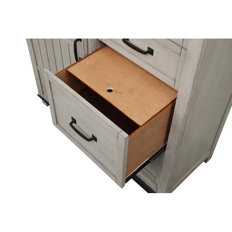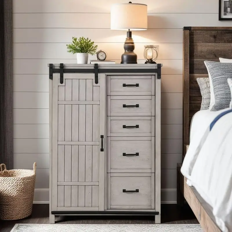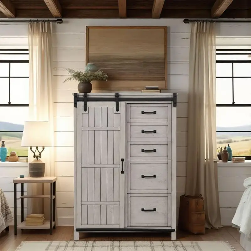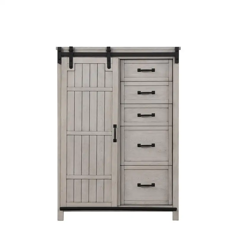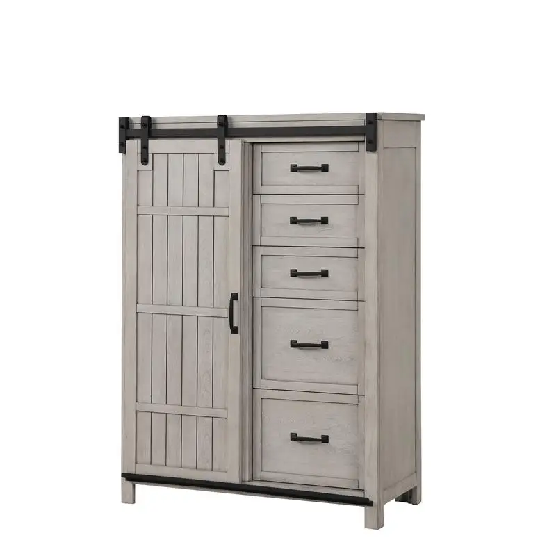 This Wardrobe Chest delivers a Modern Farmhouse-Industrial-Rustic style trifecta. Skillfully crafted from Poplar Solids and Birch Veneers, this Chest is finished in Mountain Mist with Forged Iron rivets and hardware. Featuring five drawers and one sliding barn door, this chest will provide ample storage for clothing and jewelry and make a stylish addition to your main or spare bedroom. Fully assembled upon arrival, this piece is ready to unbox and enjoy.