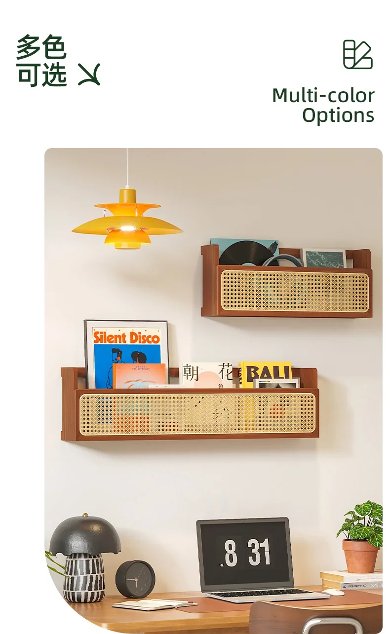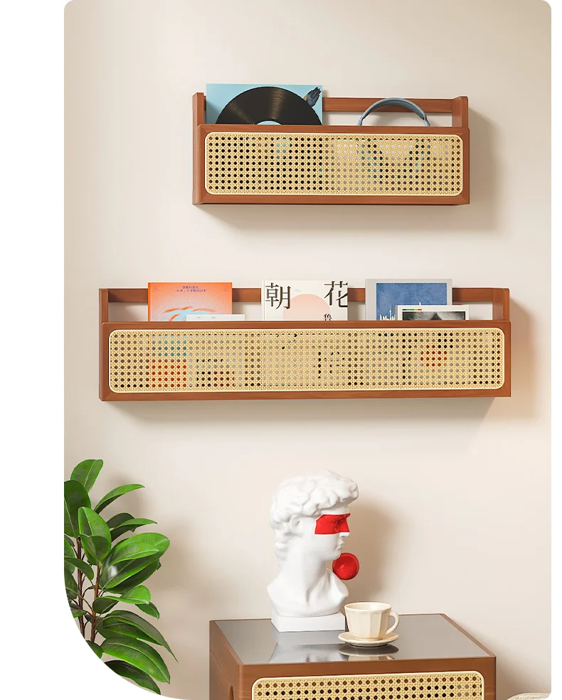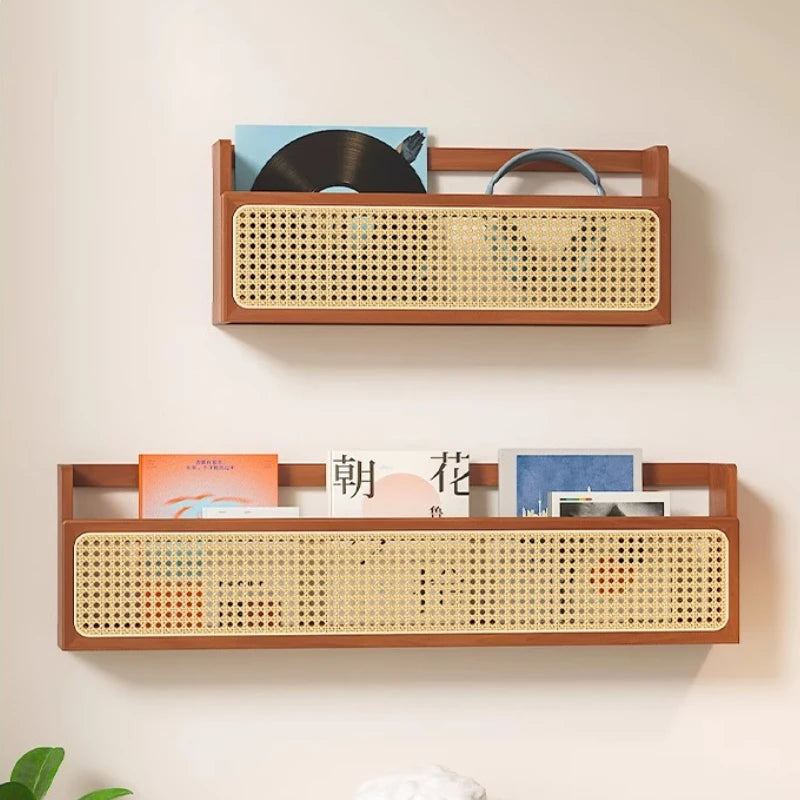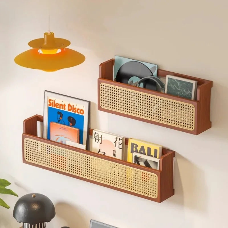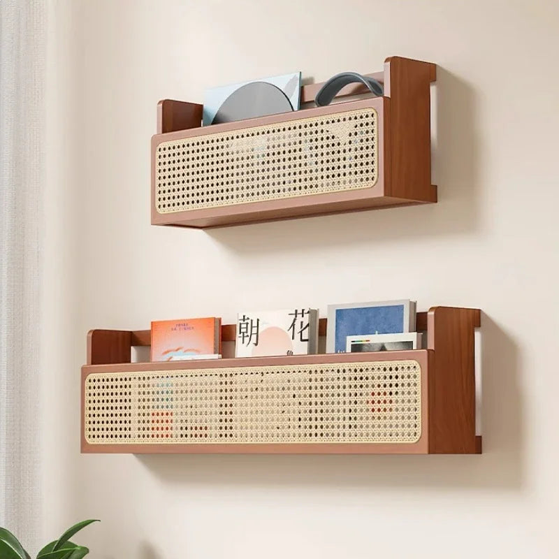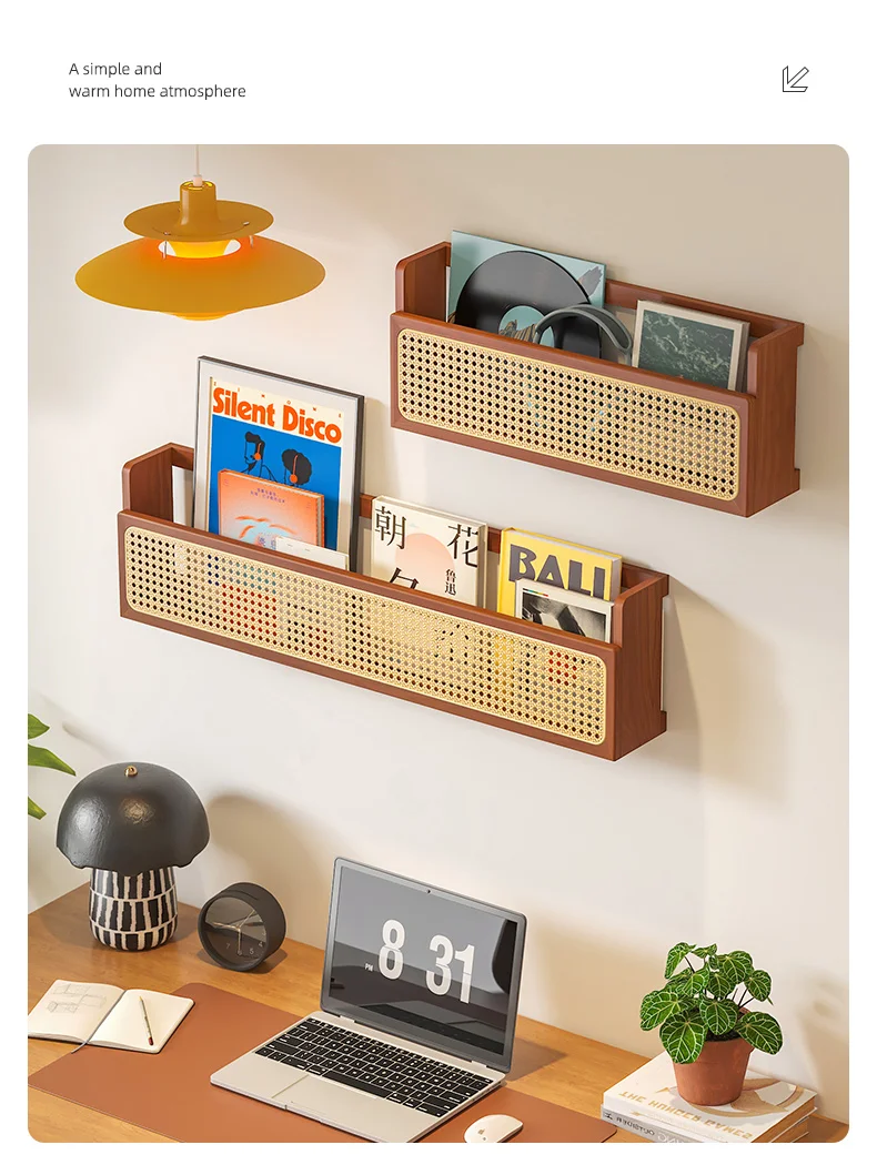 Simple Rattan Magazine Rack Vintage Bookshelf for Living Room Mid-Century Wall Mounted Book Organizer Space-saving Storage Rack