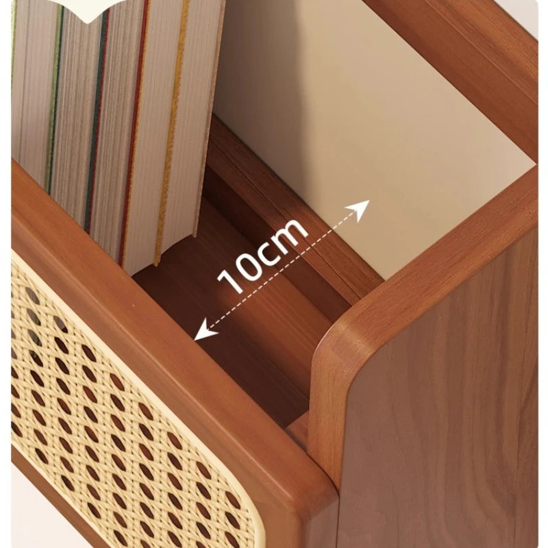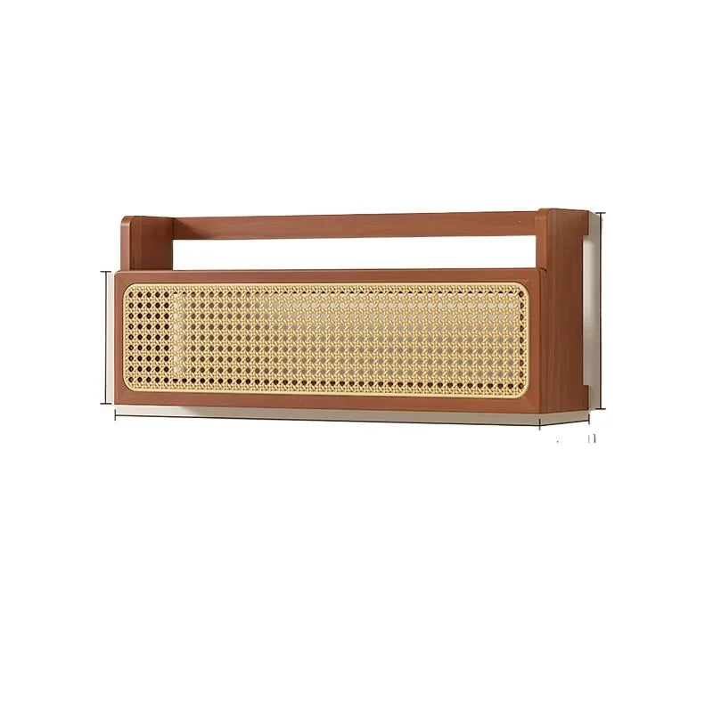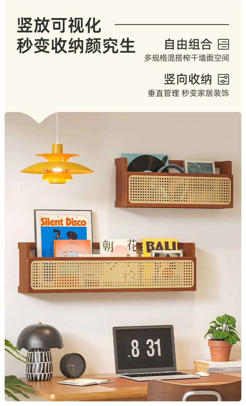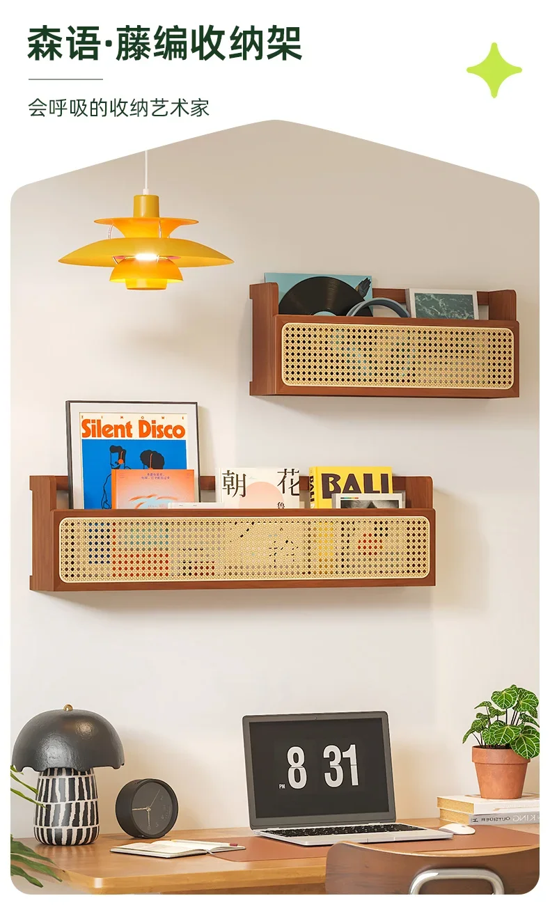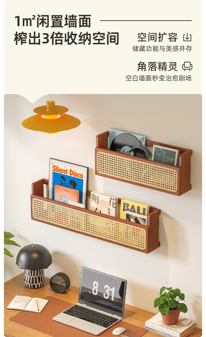 Simple Rattan Magazine Rack Vintage Bookshelf for Living Room Mid-Century Wall Mounted Book Organizer Space-saving Storage Rack