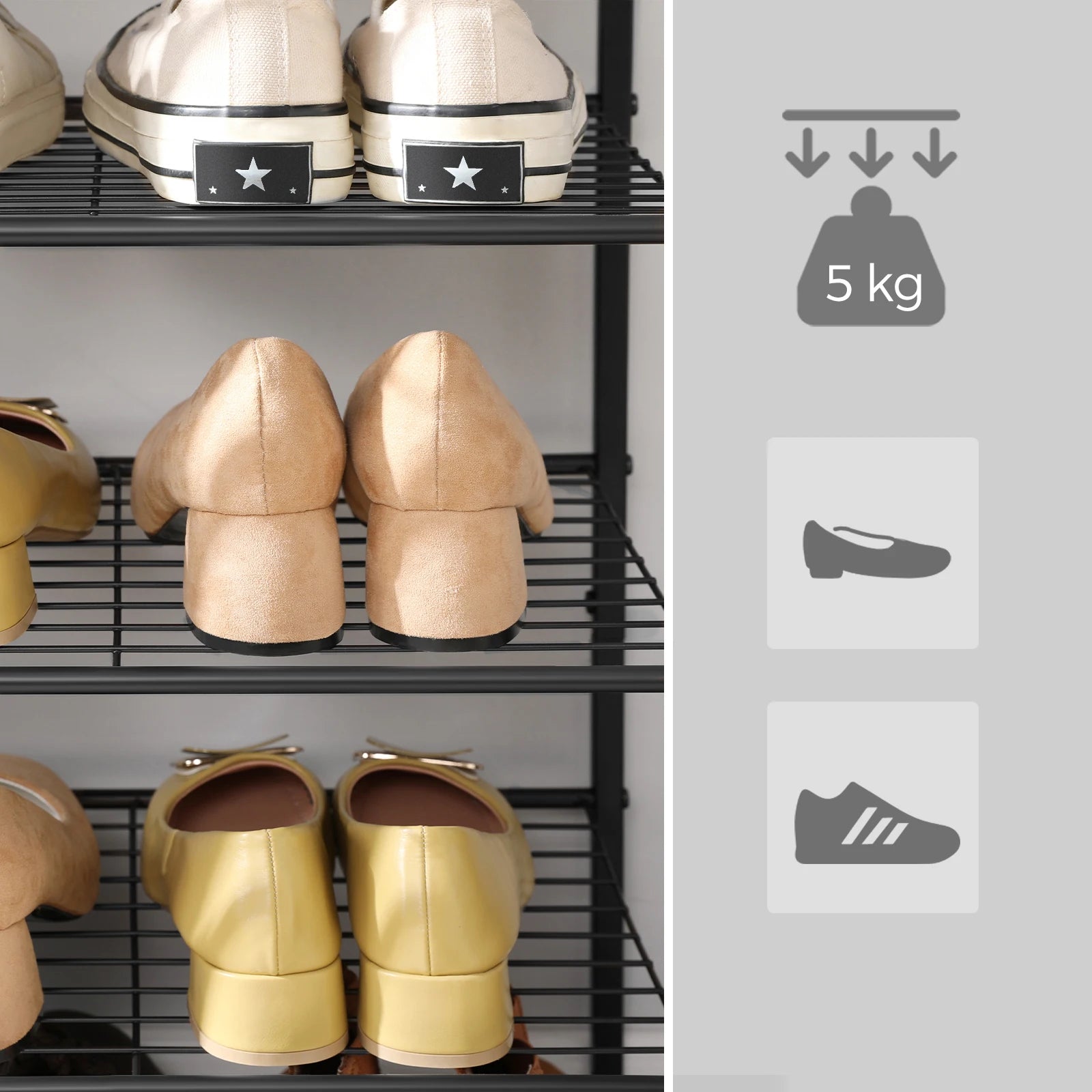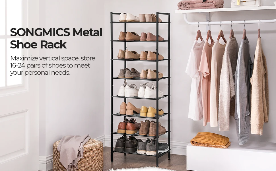 [Small Area, Large Capacity] This SONGMICS tall shoe rack has the perfect compact size for a small space. At just 1.47 sq. ft, it can hold 16-24 pairs of shoes, and even can be as a storage shelf for bags and toys